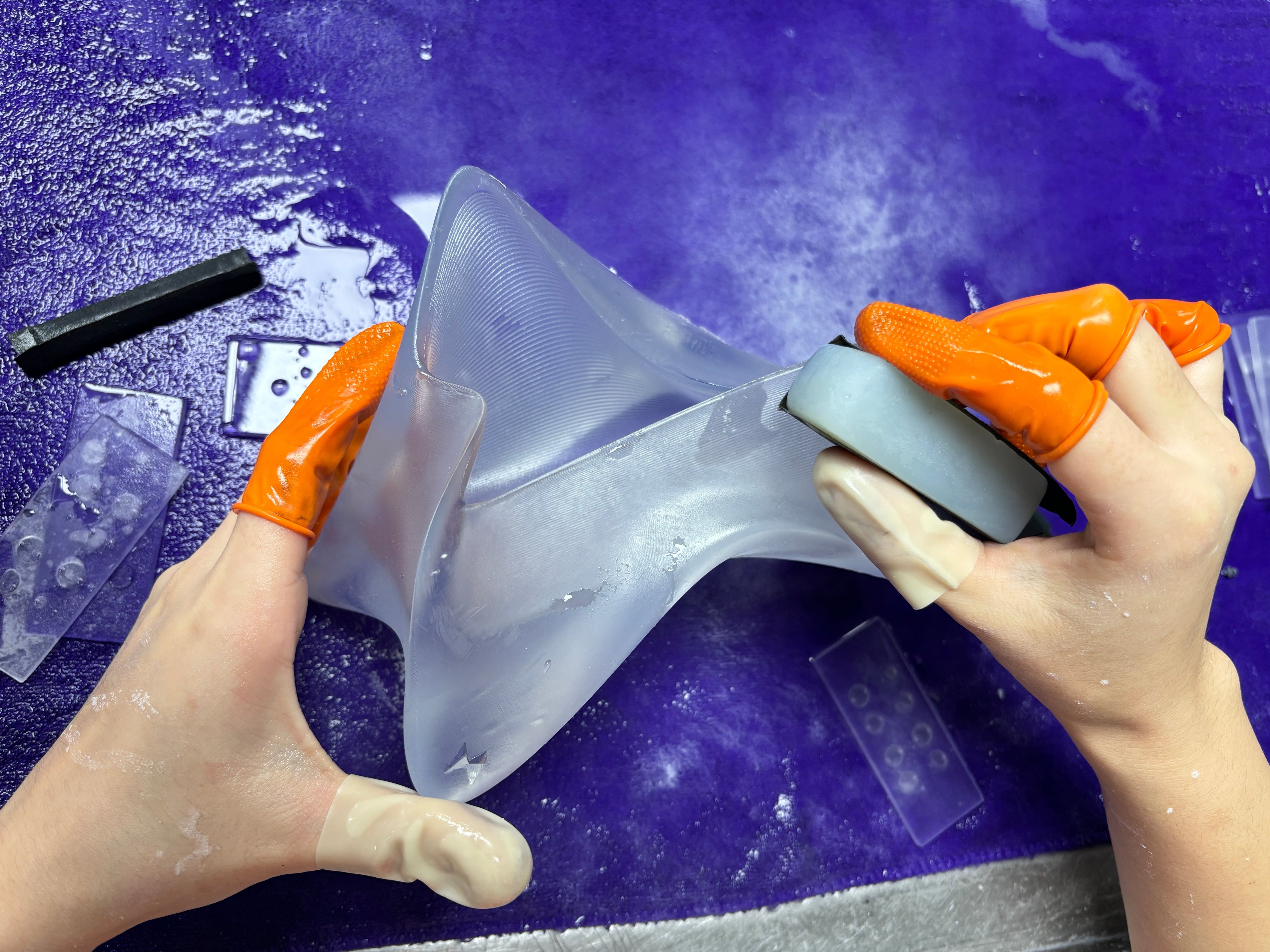 Post Printing our MESH--MESH bag we proceed with hand polishing our bags depending on the level of transparency or opaqueness.